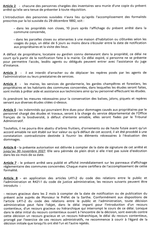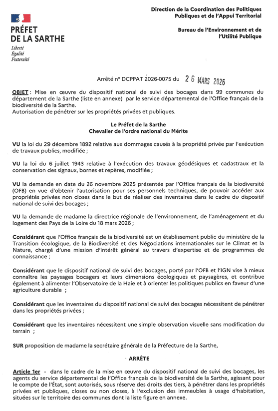 Le Bureau de l’Environnement et de l’Utilité Publique nous informe de la décision d’un arrêté préfectoral autorisant les agents du service départemental de l’Office français de la biodiversité, en vue des études relatives au dispositif national de suivi des bocages dans 99 communes du département de la Sarthe, dont Bousse, à pénétrer dans les propriétés privées sises sur le territoire de votre commune.