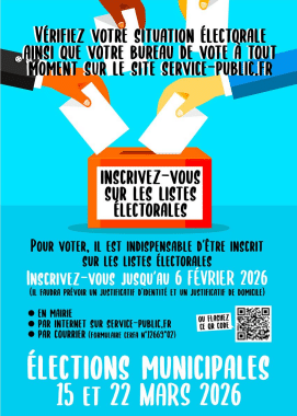 L’inscription sur les listes électorales est possible jusqu’au 6 février 2026. Elle peut se faire en ligne ou en mairie. Chaque citoyen, quelle que soit sa commune de domiciliation, pourra s’inscrire directement par internet sur le site du service public.