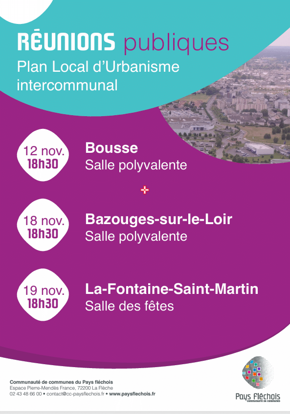 La Communauté de Communes du Pays Fléchois vous invite à une réunion publique au sujet du Plan Local d’Urbanisme Intercommunal le mercredi 12 novembre à 18h30 à la salle polyvalente.